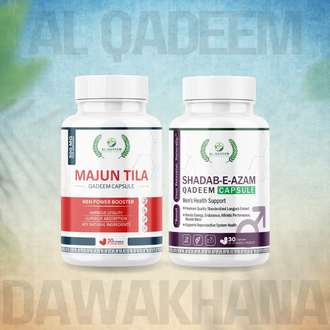 Increase stamina and strength combo pack provides a comprehensive approach to improve physical performance and endurance. Majun Tila Qadeem Capsules and Shadab E Azam Qadeem Capsules help restore energy levels, reduce fatigue, and promote muscle recovery. By nourishing the body with essential nutrients, this pack enhances stamina and physical strength, making it an ideal option for athletes, fitness-enthusiastic people, and people looking to promote their daily performance.
